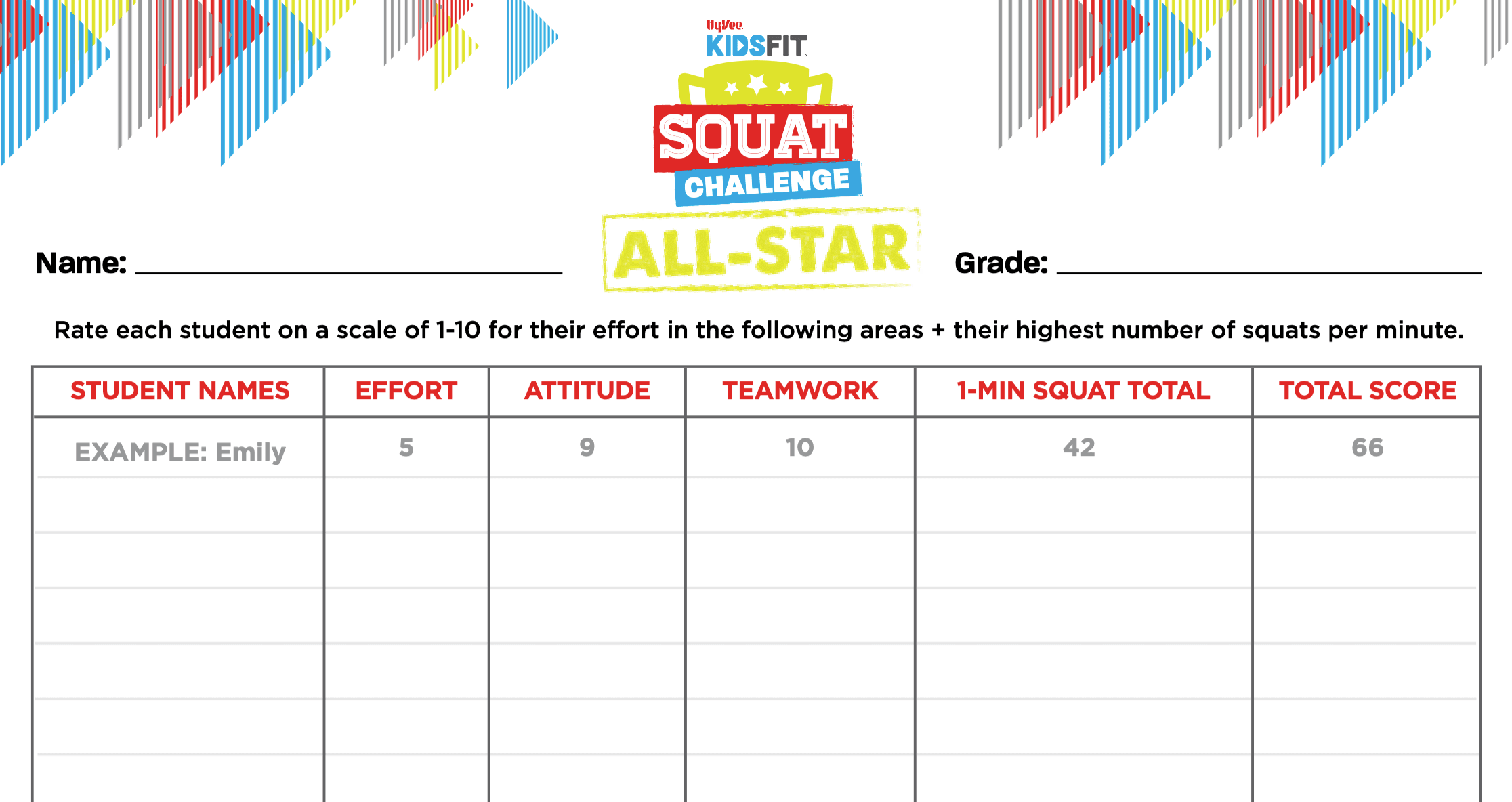 - Part of the students score will also include their personal best of a 1-min squat total, counted by the teacher or trusted peer. Students can only submit 1 of their 1-min squat total.